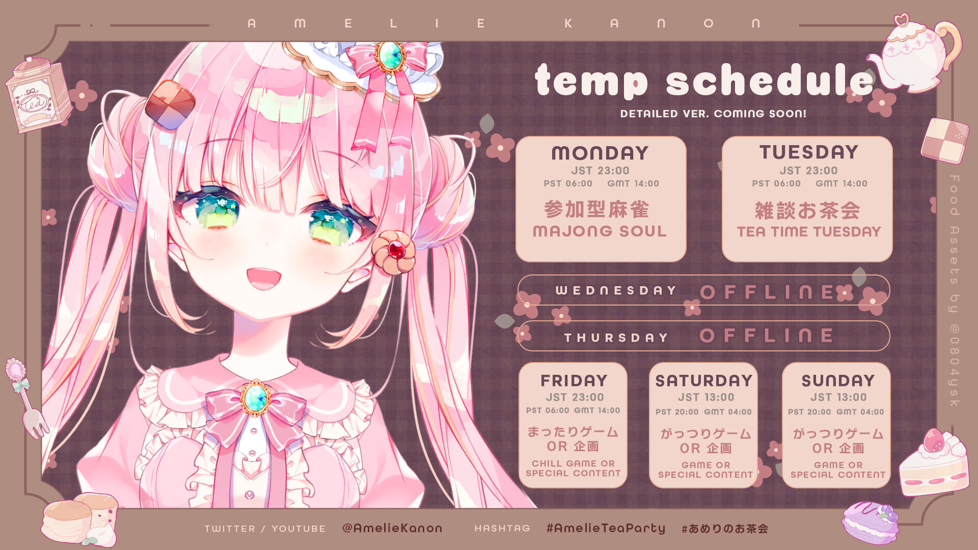 On weekends, the streams start at 1 PM JST / 8PM PST.Both English and Japanese are spoken in my stream, so feel free to speak in whichever language! Come join Amelie's tea party!